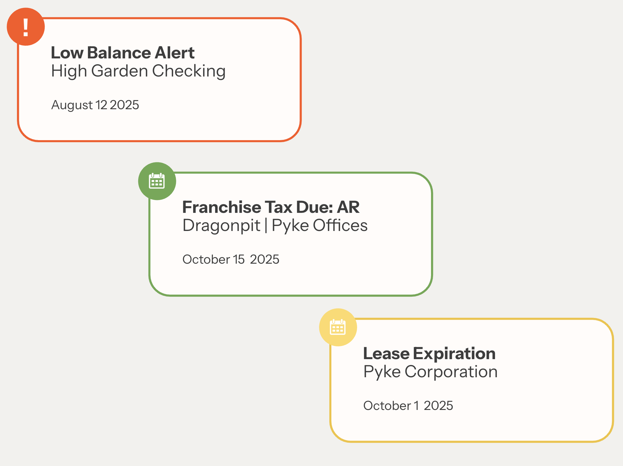 Our automatic reminders make sure you never miss key dates in your leases, loans, and property taxes. Alerts for low balances, missing payments, and more ensure nothing slips through the cracks and your money is safe from fraud.